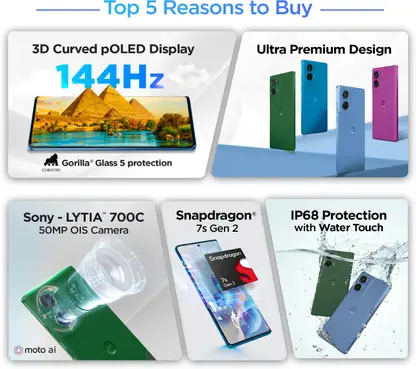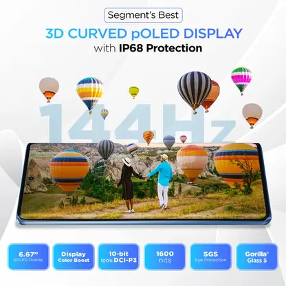 Experience the 144 Hz, 3D curved pOLED display with the advanced display color boost technology. The moto g96 5G, featuring the impressive 3D Curved Display. This engineering marvel boasts a 144Hz pOLED screen protected by ultra-durable IP68 underwater protection, accompanied by the most advanced water touch technology, and also has ultra-reliable Corning Gorilla Glass 5. The elegantly curved display provides an immersive viewing experience with its 1600nits brightness and Indulge in captivating entertainment on a 16.67 cm pOLED FHD+ ultra vivid display that has deeper blacks, bringing images to life with life-like clarity. The cinematic Billion Colour 10-Bit Display with 100% DCI-P3 works its magic to bring every moment to life, and SGS eye protection gives added protection to your eyes.